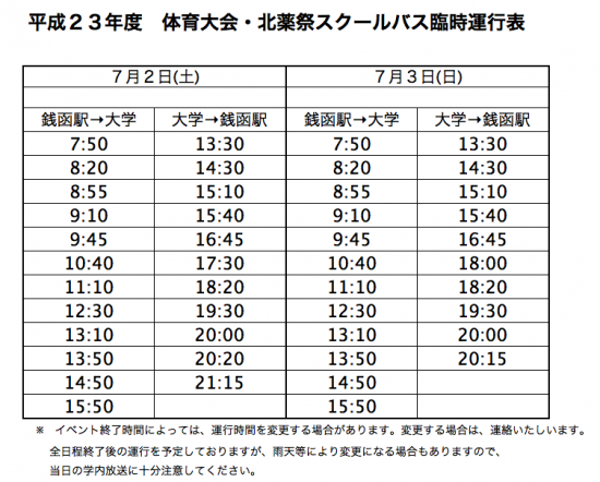 大学祭期間中のバス運行時刻表は下記の通りです。